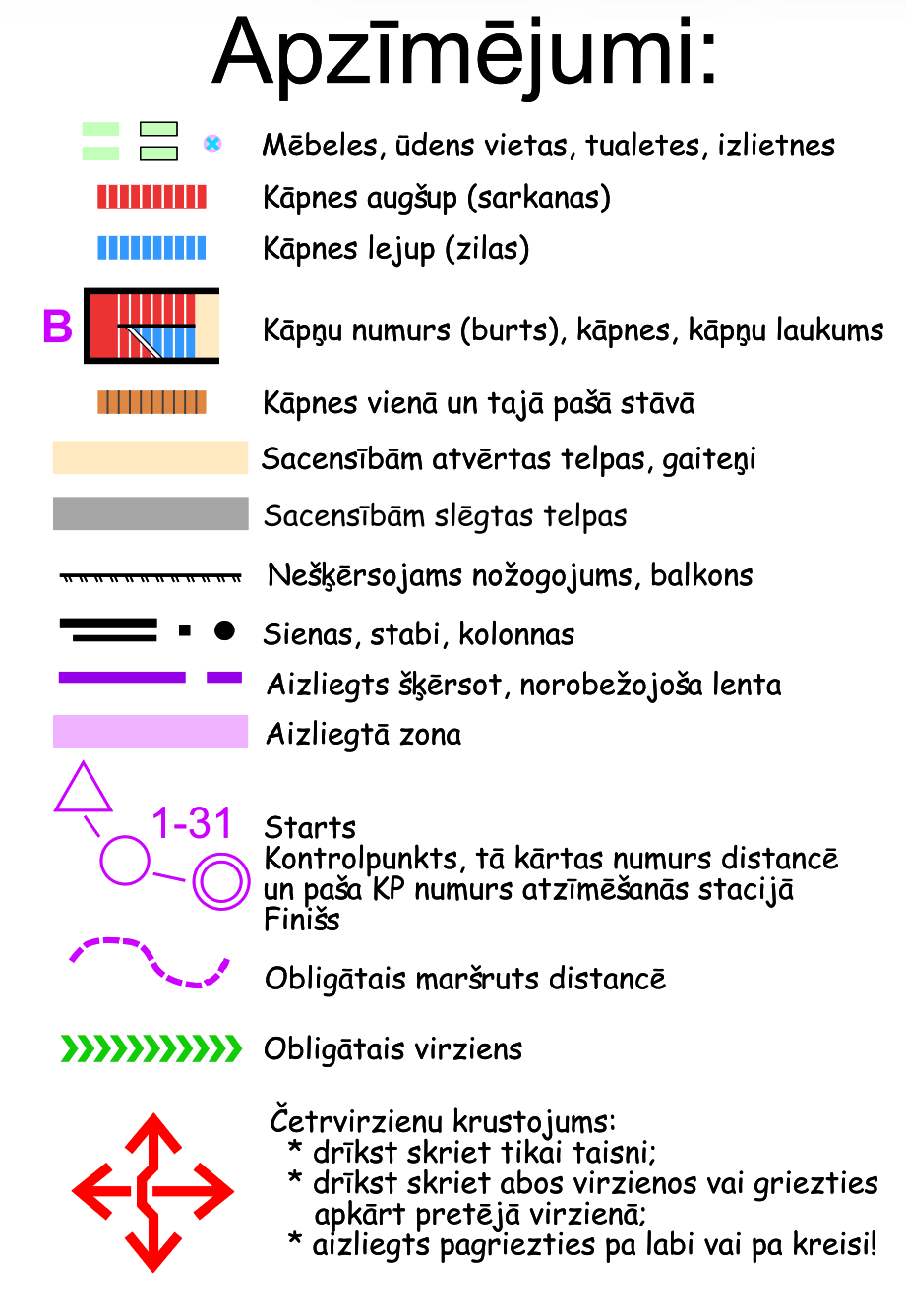 - Kāpņu telpu apkārtnē jābūt ļoti uzmanīgiem. Neuzmanība var izraisīt smagas sadursmes starp dalībniekiem. Skrienam uzmanīgi, jo pretī jebkurā vietā var nākt kāds cits dalībnieks. Ievērojam norādīto kustību virzienu!